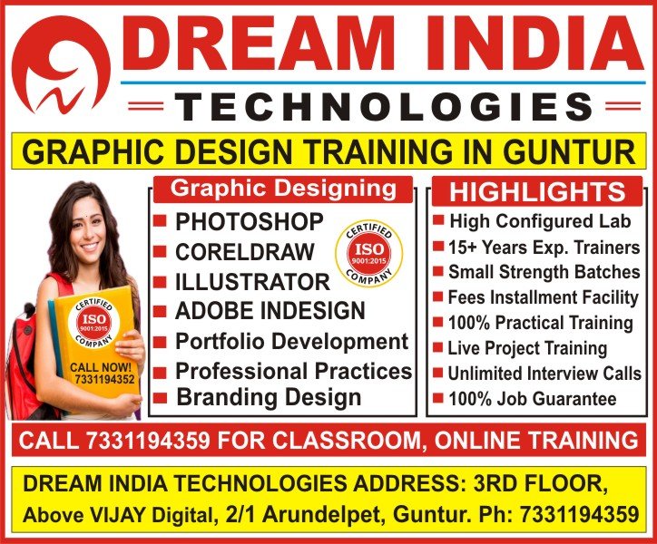 Dream India Technologies Offers Job Oriented and Placement Focused Graphic Design Training in Guntur. In Graphic Design Course we will train topic based real time scenarios from basic to Advanced Level. Learn Graphic Design Course in Guntur from no.1 Graphic Design Software Training Institute in Guntur. Call Now 7331194359 to learn Classroom, Online Graphic Design Course in Guntur. Join Now at top-rated Graphic Design Institute in Guntur to Get 100% Job Support.
