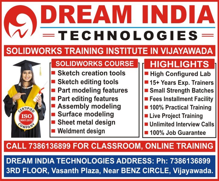 Dream India Technologies Offers Job Oriented and Placement Focused Solidworks Training in Vijayawada. In Solidworks Course we will train topic based real time scenarios from basic to Advanced Level. Learn Solidworks Course in Vijayawada from no.1 Solidworks Software Training Institute in Vijayawada. Call Now 7386136899 to learn Classroom, Online Solidworks Course in Vijayawada. Join Now at top-rated Solidworks Institute in Vijayawada to Get 100% Job Support.