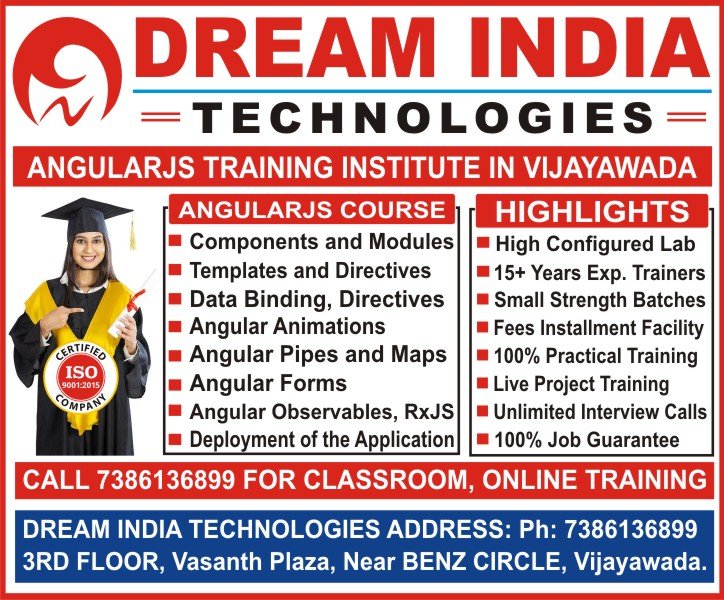 Dream India Technologies Offers Job Oriented and Placement Focused AngularJS Training in Vijayawada. In AngularJS Course we will train topic based real time scenarios from basic to Advanced Level. Learn AngularJS Course in Vijayawada from no.1 AngularJS Software Training Institute in Vijayawada. Call Now 7386136899 to learn Classroom, Online AngularJS Course in Vijayawada. Join Now at top-rated AngularJS Institute in Vijayawada to Get 100% Job Support.