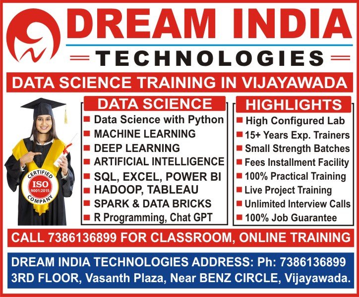 Dream India Technologies Offers Job Oriented and Placement Focused Data Science Training in Vijayawada. In Data Science Course we will train topic based real time scenarios from basic to Advanced Level. Learn Data Science Course in Vijayawada from no.1 Data Science Software Training Institute in Vijayawada. Call Now 7386136899 to learn Classroom, Online Data Science Course in Vijayawada. Join Now at top-rated Data Science Institute in Vijayawada to Get 100% Job Support.