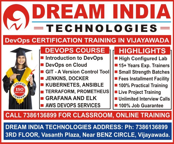 Dream India Technologies Offers Job Oriented and Placement Focused DevOps Training in Vijayawada. In DevOps Course we will train topic based real time scenarios from basic to Advanced Level. Learn DevOps Course in Vijayawada from no.1 DevOps Software Training Institute in Vijayawada. Call Now 7386136899 to learn Classroom, Online DevOps Course in Vijayawada. Join Now at top-rated DevOps Institute in Vijayawada to Get 100% Job Support.