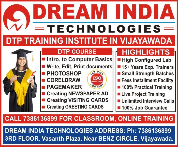 Dream India Technologies Offers Job Oriented and Placement Focused DTP Training in Vijayawada. In DTP Course we will train topic based real time scenarios from basic to Advanced Level. Learn DTP Course in Vijayawada from no.1 DTP Software Training Institute in Vijayawada. Call Now 7386136899 to learn Classroom, Online DTP Course in Vijayawada. Join Now at top-rated DTP Institute in Vijayawada to Get 100% Job Support.