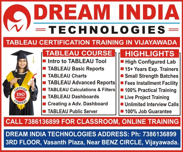 Dream India Technologies is a premier institute, that provides the Best Tableau Coaching Classes in Vijayawada. Based on the current industry standards, it helps students to get sufficient knowledge and get a job in reputed MNCs. We provide Tableau Course with 100% job Guarantee with reasonable fees. So, our course is pocket-friendly. Students from any walk of life can join this course and fulfil their dreams. Main Benefits are