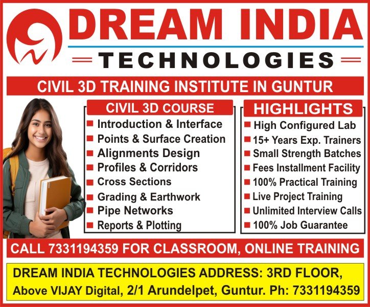 All these areas of Students can learn Civil 3D Course at Dream India Technologies. We will provide both Offline, online Civil 3D Course at our 4/1 Arundelpet, Guntur branch. We warmly welcome all these areas Bengaluru, Delhi, Chandigarh, Gurrugram, Kochi, Bhubaneswar, Anantapur, Chittoor, Kakinada, Guntur, Kadapa, Vijayawada, Machilipatnam, Kurnool, Ongole, Nellore, Srikakulam, Visakhapatnam, Vizianagaram, Eluru, Anjaw, Hawai, Changlang, Seppa, Pasighat, Kamle, Raga, Kra Daadi, Jamin, Kurung Kumey, Koloriang, Lepa Rada, Basar, Lohit, Tezu, Longding, Roing, Likabali, Ziro, Namsai, Lemmi, Yupia, Tato, Shi Yomi, Pangin, Siang, Tawang, Tirap, Anini, Yingkiong, Daporijo, Bomdila, Along, Baksa, Mushalpur, Barpeta, Bishwanath, Bongaigaon, Cachar, Silchar, Charaideo, Sonari, Chirang, Kajalgaon, Darrang, Mangaldoi, Dhemaji, Dhubri, Dibrugarh, Dima Hasao, Haflong, Goalpara, Golaghat, Hailakandi, Hojai, Jorhat, Kamrup, Amingaon, Guwahati, Diphu, Karimganj, Kokrajhar, Lakhimpur, Majuli, Garamur, Marigaon, Nagaon, Nalbari, Sibsagar, Hatsingimari, Tezpur, Sonitpur, Tinsukia, Udalguri, Hamren, Adilabad, Kothagudem, Hyderabad, Jagtial, Jangaon, Bhupalpalle, Gadwal, Kamareddy, Karimnagar, Khammam, Mahabubabad, Mahbubnagar, Mancherial, Medak, Shamirpet, Mulugu, Nalgonda, Narayanpet, Nagarkurnool, Nirmal, Nizamabad, Peddapalle, Sircilla, Shamshabad, Sangareddy, Siddipet, Suryapet, Vikarabad, Wanaparthy, Warangal, Bhongiri, Banjara Hills, Dilsukhnagar, Koti, Punjagutta, Begumpet, Jubilee Hills, Mehdipatnam, Kukatpally, Abids, Ameerpet, BHEL, Baksa, Mushalpur, Barpeta, Bishwanath, Bongaigaon, Cachar, Silchar, Charaideo, Sonari, Chirang, Kajalgaon, Darrang, Mangaldoi, Dhemaji, Dhubri, Dibrugarh, Haflong, Goalpara, Golaghat, Hailakandi, Hojai, Jorhat, Kamrup, Amingaon, Guwahati, Diphu, Karimganj, Kokrajhar, Lakhimpur, Majuli, Garamur, Morigaon, Nagaon, Nalbari, Sivasagar, Hatsingimari, Sonitpur, Tezpur, Tinsukia, Tinsukia, Udalguri, Hamren, Araria, Arwal, Aurangabad, Banka, Begusarai, Bhagalpur, Bhojpur, Arrah, Buxar, Darbhanga, Motihari, Gaya, Gopalganj, Jamui, Jehanabad, Kaimur, Bhabua, Katihar, Khagaria, Kishanganj, Lakhisarai, Madhepura, Madhubani, Munger, Muzaffarpur, Nalanda, Nawada, Patna, Purnia, Rohtas, Saharsa, Samastipur, Saran, Chhapra, Sheikhpura, Sheohar, Sitamarhi, Siwan, Supaul, Vaishali, Hajipur, Bettiah, Balod, Baloda Bazar, Balrampur, Bastar, Jagdalpur, Bemetara, Bijapur, Bilaspur, Dantewada, Dhamtari, Durg, Gariaband, Jashpur, Kabirdham, Kawardha, Kanker, Kondagaon, Korba, Koriya, Baikunthpur, Mahasamund, Mungeli, Narayanpur, Raigarh, Raipur, Rajnandgaon, Sukma, Surajpur, Surguja, North Goa, Panaji, Margao, Ahmedabad, Amreli, Anand, Aravalli, Modasa, Banaskantha, Palanpur, Bharuch, Bhavnagar, Botad, Dahod, Dang, Ahwa, Khambhalia, Gandhinagar, Veraval, Jamnagar, Junagadh, Kheda, Nadiad, Kutch, Mahisagar, Lunavada, Mehsana, Morbi, Narmada, Rajpipla, Navsari, Panchmahal, Godhra, Patan, Porbandar, Rajkot, Sabarkantha, Himatnagar, Surat, Surendranagar, Tapi, Vyara, Vadodara, Valsad, Ambala, Bhiwani, Charkhi Dadri, Faridabad, Fatehabad, Gurgaon, Hissar, Jhajjar, Jind, Kaithal, Karnal, Kurukshetra, Mahendragarh, Narnaul, Nuh, Palwal, Panchkula, Panipat, Rewari, Rohtak, Sirsa, Sonipat, Yamuna Nagar, Bilaspur, Chamba, Hamirpur, Kangra, Dharamshala, Kinnaur, Reckong Peo, Kullu, Keylong, Mandi, Shimla, Sirmaur, Nahan, Solan, Una, Bokaro, Chatra, Deoghar, Dhanbad, Dumka, Jamshedpur, Garhwa, Giridih, Godda, Gumla, Hazaribag, Jamtara, Khunti, Koderma, Latehar, Lohardaga, Pakur, Palamu, Daltonganj, Ramgarh, Ranchi, Sahibganj, Seraikela, Simdega, Chaibasa, Bagalkot, Ballari, Belgaum, Bangalore, Bidar, Chamarajanagar, Chikkaballapura, Chikmagalur, Chitradurga, Mangaluru, Davanagere, Dharwad, Gadag, Gulbarga, Hassan, Haveri, Kodagu, Madikeri, Kolar, Koppal, Mandya, Mysore, Raichur, Ramanagara, Shimoga, Tumakuru, Udupi, Karwar, Bijapur, Yadgir, Alappuzha, Ernakulam, Kakkanad, Idukki, Painavu, Kannur, Kasaragod, Kollam, Kottayam, Kozhikode, Malappuram, Palakkad, Pathanamthitta, Thrissur, Thiruvananthapuram, Wayanad, Kalpetta, Agar, Alirajpur, Anuppur, Ashok Nagar, Balaghat, Barwani, Betul, Bhind, Bhopal, Burhanpur, Chhatarpur, Chhindwara, Damoh, Datia, Dewas, Dhar, Dindori, Guna, Gwalior, Harda, Hoshangabad, Indore, Jabalpur, Jhabua, Katni, Khandwa, Khargone, Maihar, Mandla, Mandsaur, Morena, Narsinghpur, Nagda, Neemuch, Niwari, Panna, Raisen, Rajgarh, Ratlam, Rewa, Sagar, Satna, Sehore, Seoni, Shahdol, Shajapur, Sheopur, Shivpuri, Sidhi, Singrauli, Waidhan, Tikamgarh, Ujjain, Umaria, Vidisha, Ahmednagar, Akola, Amravati, Aurangabad, Beed, Bhandara, Buldhana, Chandrapur, Dhule, Gadchiroli, Gondia, Hingoli, Jalgaon, Jalna, Kolhapur, Latur, Mumbai, Bandra, Nanded, Nandurbar, Nagpur, Nashik, Osmanabad, Palghar, Parbhani, Pune, Raigad, Ratnagiri, Sangli, Satara, Sindhudurg, Oros, Solapur, Thane, Wardha, Washim, Yavatmal, Bishnupur, Chandel, Churachandpur, Porompat, Lamphelpat, Jiribam, Kakching, Kamjong, Kangpokpi, Noney, Pherzawl, Senapati, Tamenglong, Tengnoupal, Thoubal, Ukhrul, East Garo Hills, Williamnagar, East Khasi Hills, Shillong, East Jaintia Hills, Khliehriat, North Garo Hills, Resubelpara, Ri Bhoi, Nongpoh, South Garo Hills, Baghmara, South West Garo Hills, Ampati, South West Khasi Hills, Mawkyrwat, West Jaintia Hills, Jowai, West Garo Hills, Tura, West Khasi Hills, Nongstoin, Aizawl, Champhai, Hnahthial, Khawzawl, Kolasib, Lawngtlai, Lunglei, Mamit, Saiha, Saitual, Serchhip, Dimapur, Kiphire, Kohima, Longleng, Mokokchung, Mon, Noklak, Peren, Phek, Tuensang, Wokha, Zunheboto, Angul, Boudh, Bhadrak, Balangir, Bargarh, Balasore, Cuttack, Debagarh, Dhenkanal, Ganjam, Chhatrapur, Gajapati, Paralakhemundi, Jharsuguda, Jajpur, Panikoili, Jagatsinghpur, Khordha, Kendujhar, Kalahandi, Bhawanipatna, Kandhamal, Phulbani, Koraput, Kendrapara, Malkangiri, Mayurbhanj, Baripada, Nabarangpur, Nuapada, Nayagarh, Puri, Rayagada, Sambalpur, Subarnapur, Sundargarh, Amritsar, Barnala, Bathinda, Firozpur, Faridkot, Fatehga