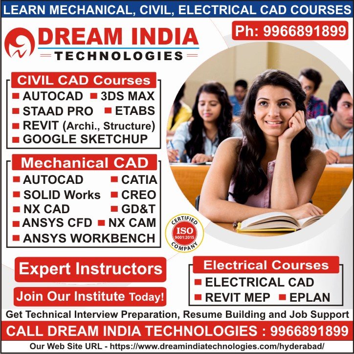 Dream India Technologies offers professional Mechanical, Civil, Electrical CAD courses in Ameerpet, Hyderabad. Learn to design, draft, and model with practical, hands-on training. Our courses cover AutoCAD, Revit, STAAD Pro, ETABS, 3DS Max, Sketch up, SolidWorks, CATIA, NX CAD, Fusion 360, and Creo. Gain real-time project experience and expert guidance from industry-trained professionals. Build career-ready skills and step into high-demand roles in engineering, design, and architecture.