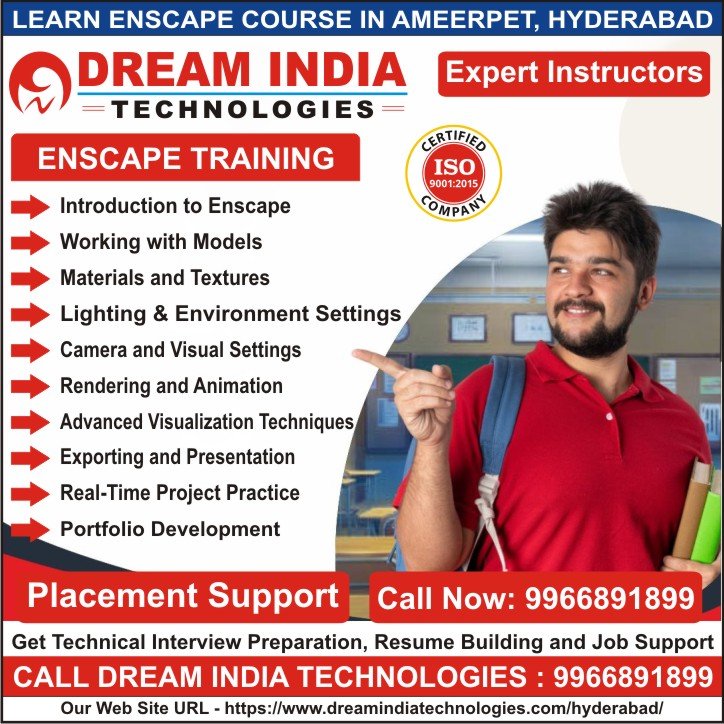 The Enscape Training in Ameerpet offered by Dream India Technologies helps students and professionals learn real-time rendering and visualization easily. Our course teaches how to create realistic images, videos, and walkthroughs directly from design software. You will learn to work with lighting, materials, and environments using Enscape tools. Our expert trainers provide step-by-step guidance with real-time projects. Learn Enscape Course in Ameerpet from No.1 Enscape Training Institute in Hyderabad. Call Now - 9966891899 to learn Classroom, Online Enscape course in Ameerpet.