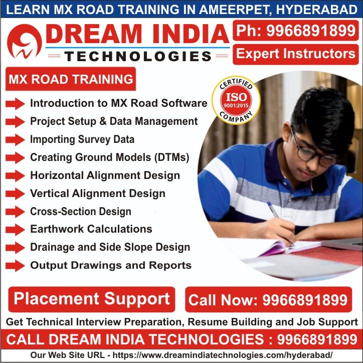 Join the best MX Road course in Hyderabad at Dream India Technologies to gain practical skills in road design and modeling. Our trainers provide step-by-step guidance on survey data import, alignment design, terrain modeling, and earthwork calculation. With real-time projects and industry-relevant training, students gain confidence in handling professional road design tasks. We are one of the leading MX Road institutes in Hyderabad, offering certification and placement support. Enroll now in our MX Road course in Hyderabad to advance your civil engineering career with hands-on learning. Follow Us: