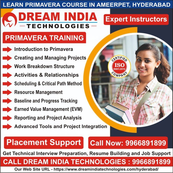 Dream India Technologies offers the best Primavera Training in Ameerpet for professionals and students in construction, civil, and project management fields. Learn project planning, scheduling, resource allocation, and critical path method with real-time examples. Our course covers both Primavera P6 software and practical project management techniques. Get hands-on experience with live projects and enhance your career opportunities. Learn Primavera Course in Ameerpet from No.1 Primavera Training Institute in Hyderabad. Call Now - 9966891899 to learn Classroom, Online Primavera course in Ameerpet.