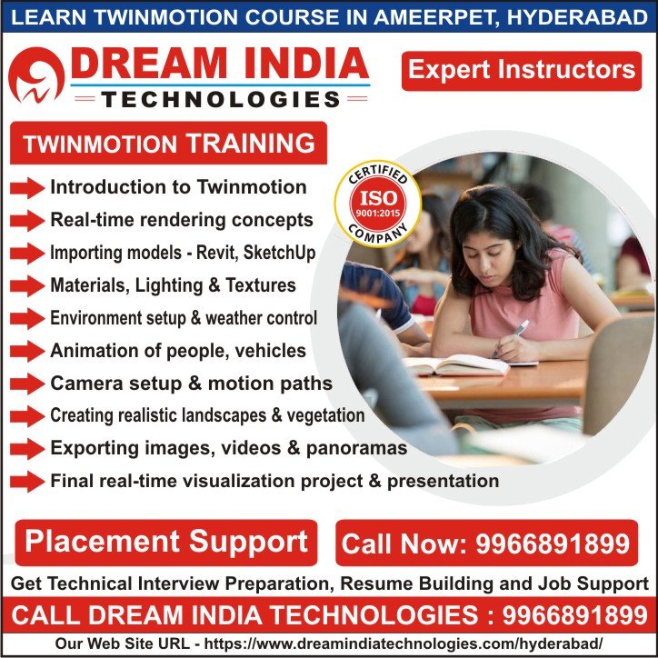Dream India Technologies offers the best Twinmotion Training in Ameerpet with expert guidance and practical learning. Our course helps you create realistic 3D visualizations, walkthroughs, and animations with ease. You will learn lighting, materials, and rendering techniques in simple steps. We provide real-time projects to enhance your creative and technical skills. Learn Twinmotion Course in Ameerpet from No.1 Twinmotion Training Institute in Hyderabad. Call Now - 9966891899 to learn Classroom, Online Twinmotion course in Ameerpet.
