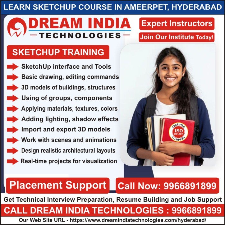 Looking for the best SketchUp institutes in Hyderabad? Dream India Technologies is the top SketchUp institutes in Ameerpet, Hyderabad. We are offering hands-on training with real-time projects. The SketchUp course in Hyderabad is designed for students, architects, and interior designers to master 3D modeling and visualization. Join our SketchUp course in Hyderabad to gain practical skills and learn from industry experts. Our SketchUp institutes in Hyderabad provide ISO-certified certificates, career guidance, and placement support. Enroll in the SketchUp course in Hyderabad to advance your career in architecture, interior design, and 3D modeling. Follow Us:
