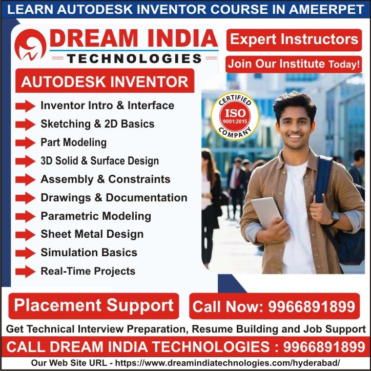 Learning the Inventor Course in Ameerpet from Dream India Technologies gives you quality training with practical exposure. You learn from experienced industry trainers. The course covers all core and advanced Inventor topics. You work on real-time projects for better understanding. Small batch sizes help you get personal attention. Daily lab practice improves your skills. Flexible timings support students and working professionals. Affordable fees make it easy to enroll. Placement guidance is also provided after course completion.