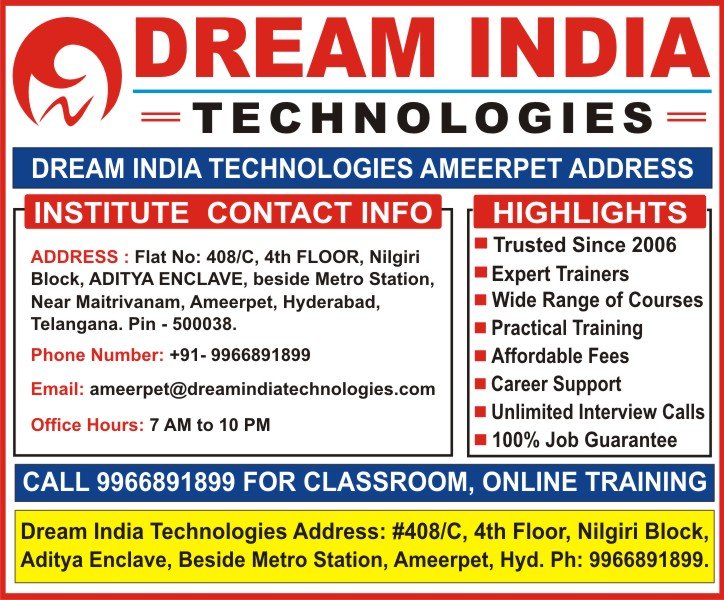 DREAM INDIA TECHNOLOGIES Ameerpet Address: Flat No: 408/C, 4th FLOOR, Nilgiri Block, ADITYA ENCLAVE, beside Metro Station, near Maitrivanam, Ameerpet, Hyderabad, Telangana. Pin - 500038. 9966891899 .