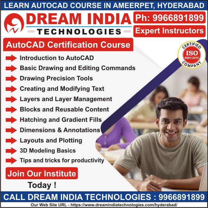 Dream India Technologies is one of the leading AutoCAD institutes in Ameerpet, offering expert-led training with real-time projects. Our AutoCAD course in Hyderabad is designed for students, engineers, and professionals who want to master 2D drafting and 3D modeling. With our AutoCAD course in Hyderabad, you’ll gain hands-on experience, learn from experienced trainers, and earn an ISO-certified certificate to boost your career in design, drafting, and engineering. Follow Us: