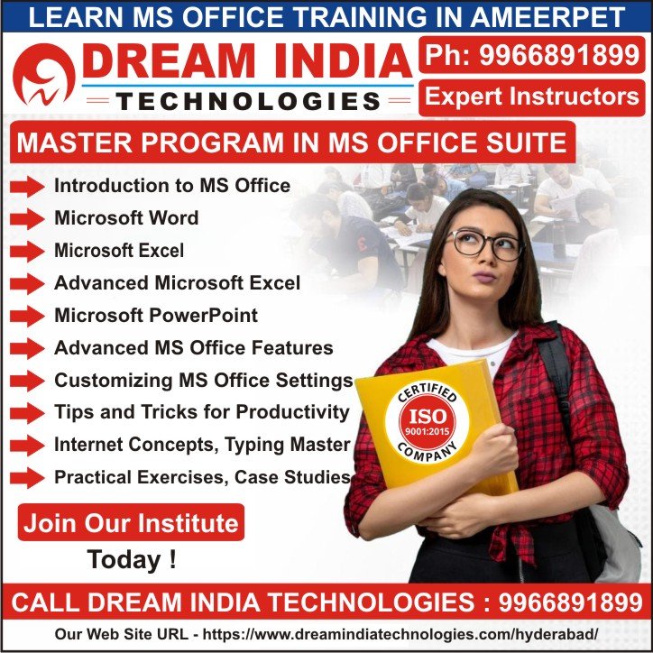 Boost your career with MS Office Training at Dream India Technologies in Ameerpet. Learn MS Word, Excel, PowerPoint, and Outlook from highly experienced trainers with practical, real-time sessions. Students receive a textbook and workbook for guided learning. Enjoy air-conditioned classrooms and a fully equipped lab for hands-on practice. Complete the course and earn an ISO-certified certificate to enhance your skills and job opportunities.