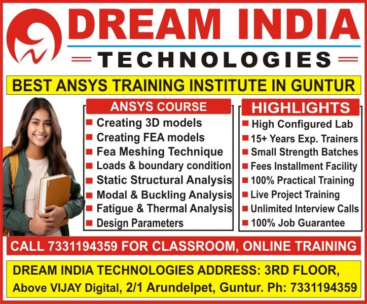 Dream India Technologies is the Best Ansys INSTITUTE in Guntur, No.1 Software Training Institute for Ansys CFD, Advanced Ansys Workbench Course in Guntur. We Offer job oriented and placement Focused Classroom, Online Ansys Training in Guntur. In Ansys Course we will cover all fundamentals to advanced topics of ANSYS Software. We will train how to create Finite Element Modeling (FEM), and Finite Element Analysis (FEA) with Live Project.
